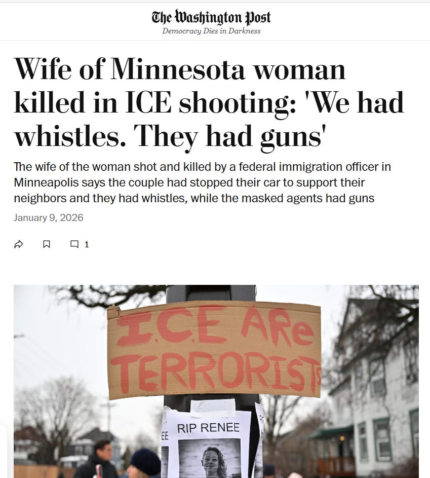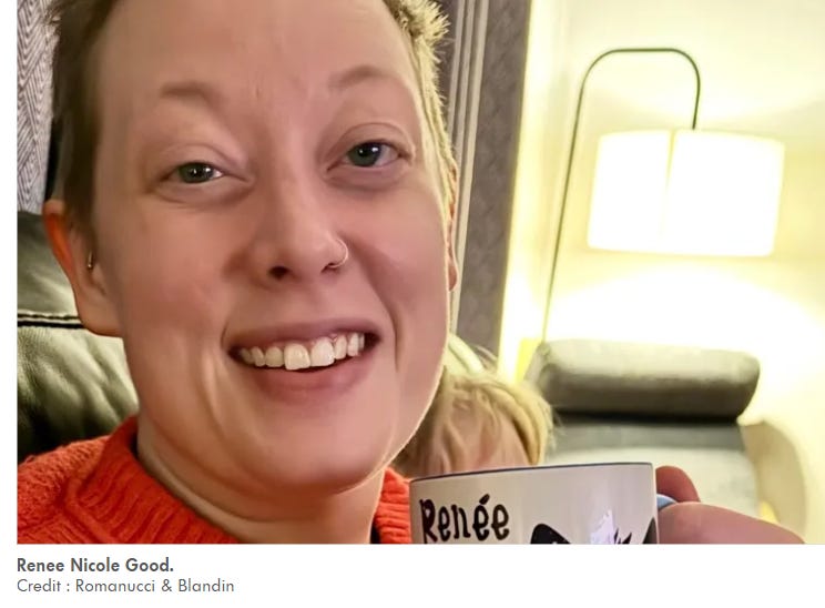 But every facet of that sympathy-promoting hagiography is untrue. Not only were the Goods unmarried, the six-year-old son belonged to Renee only. (His father, Renee’s second husband, died in 2023.) The pair relocated to Minneapolis just last March, hardly qualifying as their “community.” In 2023, as I posted here, Renee Good successfully petitioned to change her last name to Good; it was not a result of marriage.