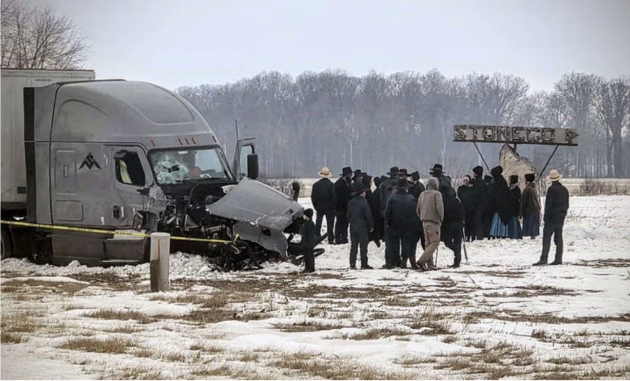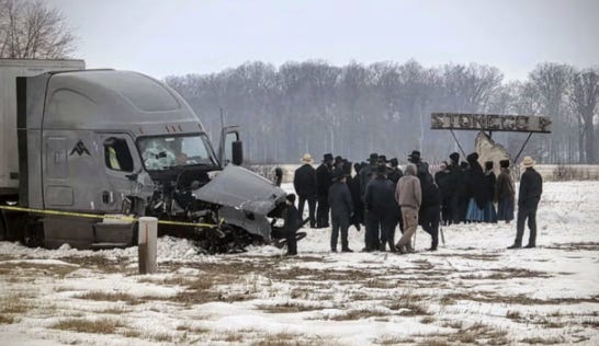 The van was driven by Donald Stipp, 55, of Portland. With him were members of Bryant, Indiana’s Amish community: Henry Eicher, 50; his sons Menno, 25, and Paul, 19; and a family friend, Simon Girod, 23.