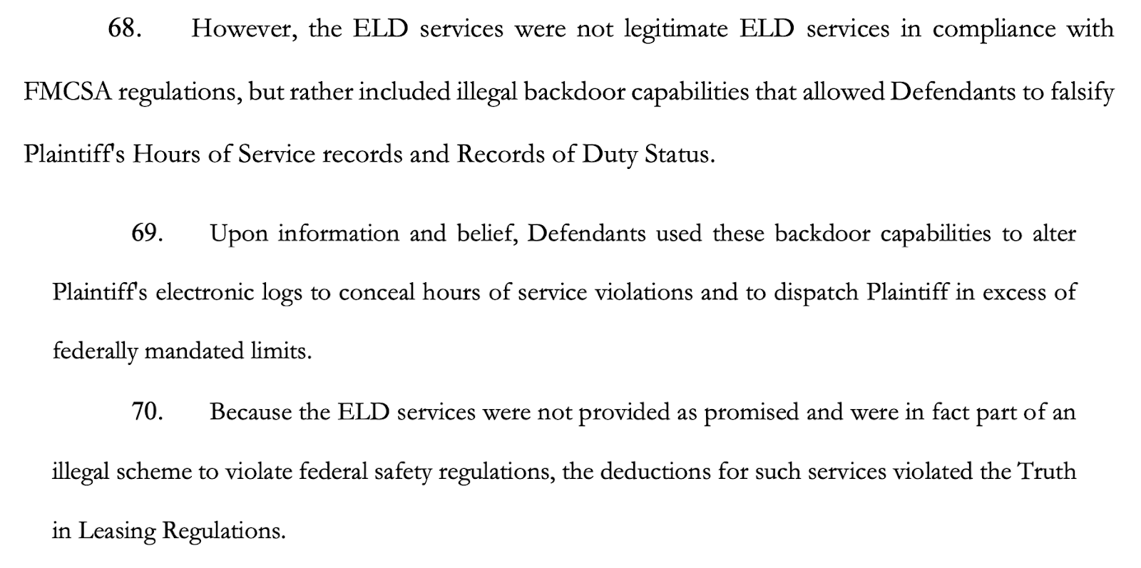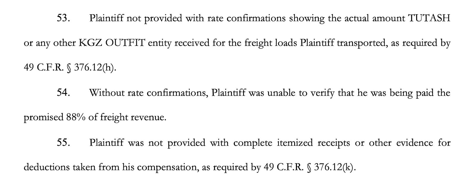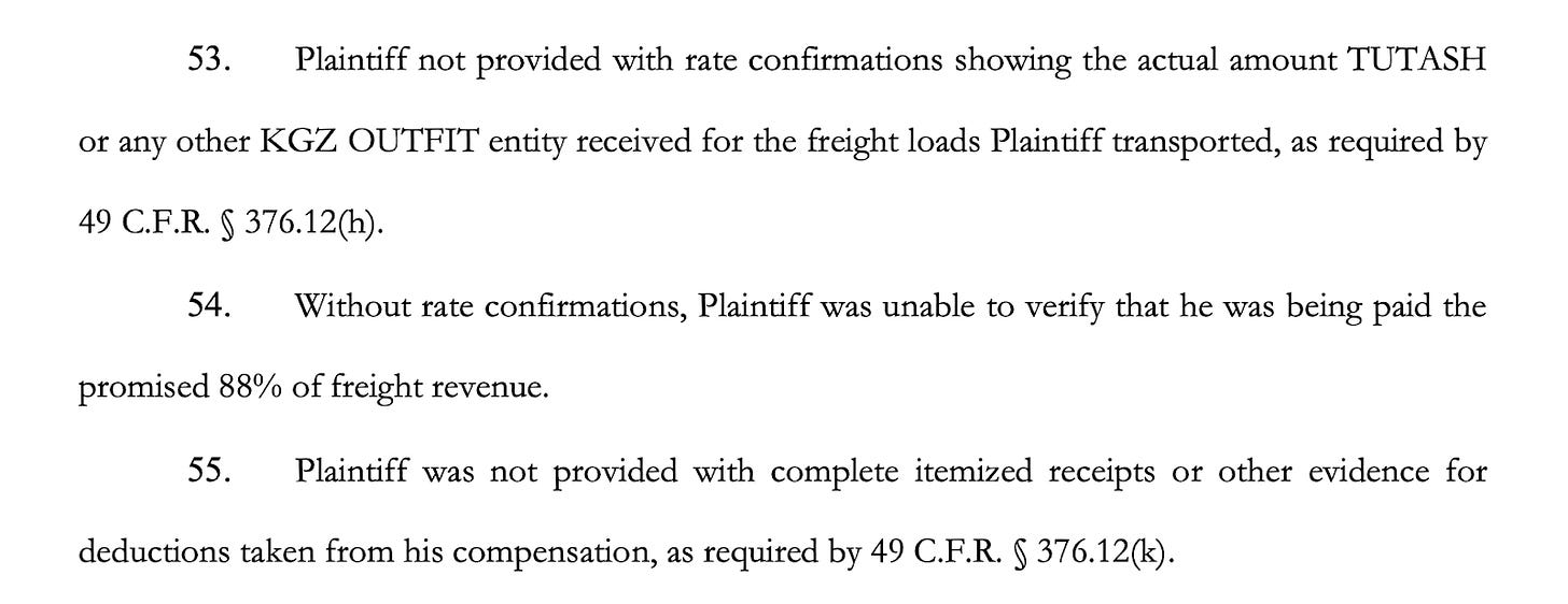 Despite that, the complaint says deductions continued to appear in weekly settlements. Charges were taken for fuel, insurance, dispatch services, repairs, and electronic logging systems. The driver alleges that many of these amounts were withheld without the required receipts or supporting documentation under federal rules.
