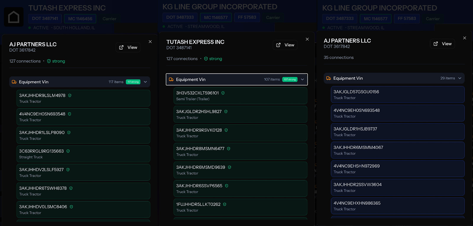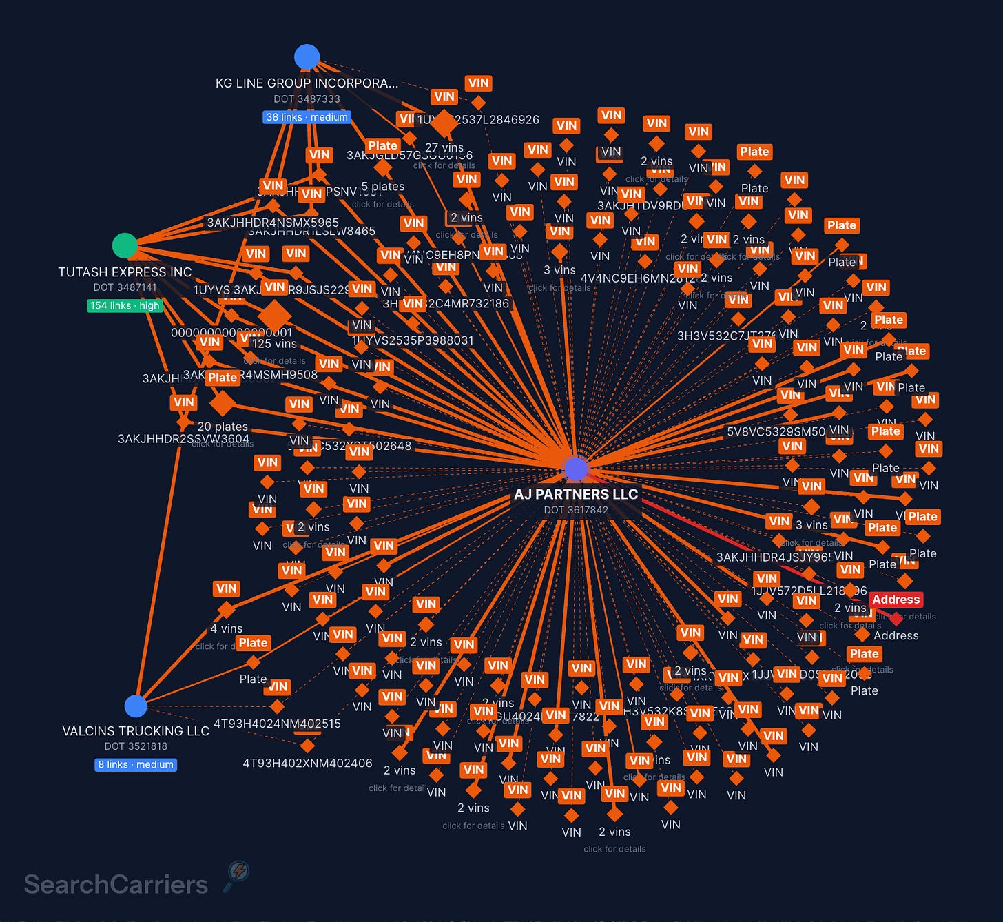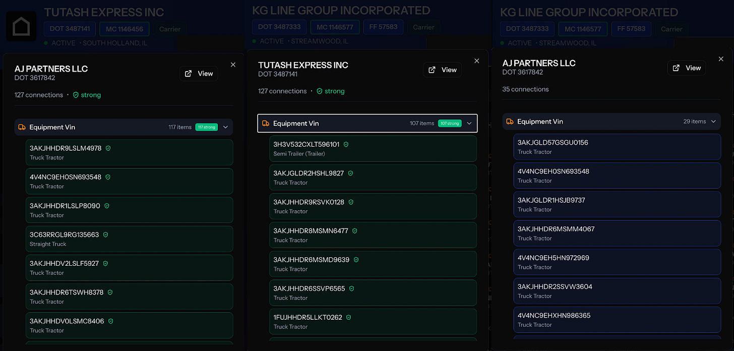 AJ Partners LLC shares 127 VINs with Tutash Express Inc. The same trucks were inspected under different carriers 127 times. Many of those VINs also appear under KG Line Group.