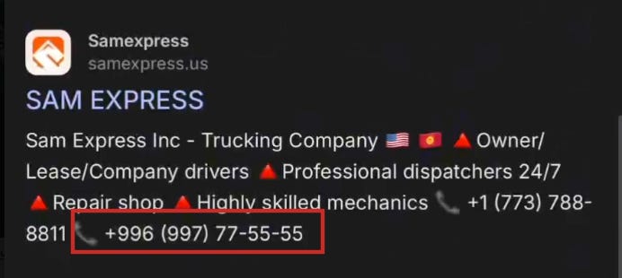 Sam Express’s public materials display Kyrgyzstan’s country code, +996, alongside American and Kyrgyz flags.