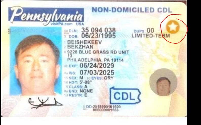 Looks like Blue states might be handing out Real IDs to anybody. This guy "crossed the U.S. border in 2023 using the Biden-created CBP One phone app and received a non-domiciled commercial driver’s license (CDL) from the state of Pennsylvania last year."