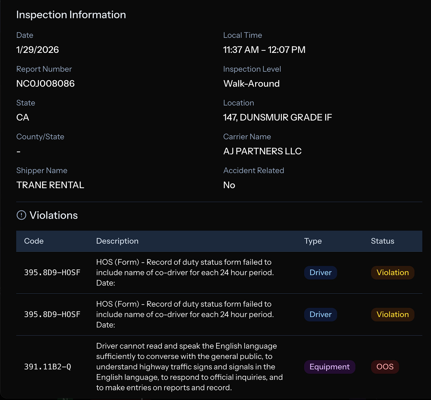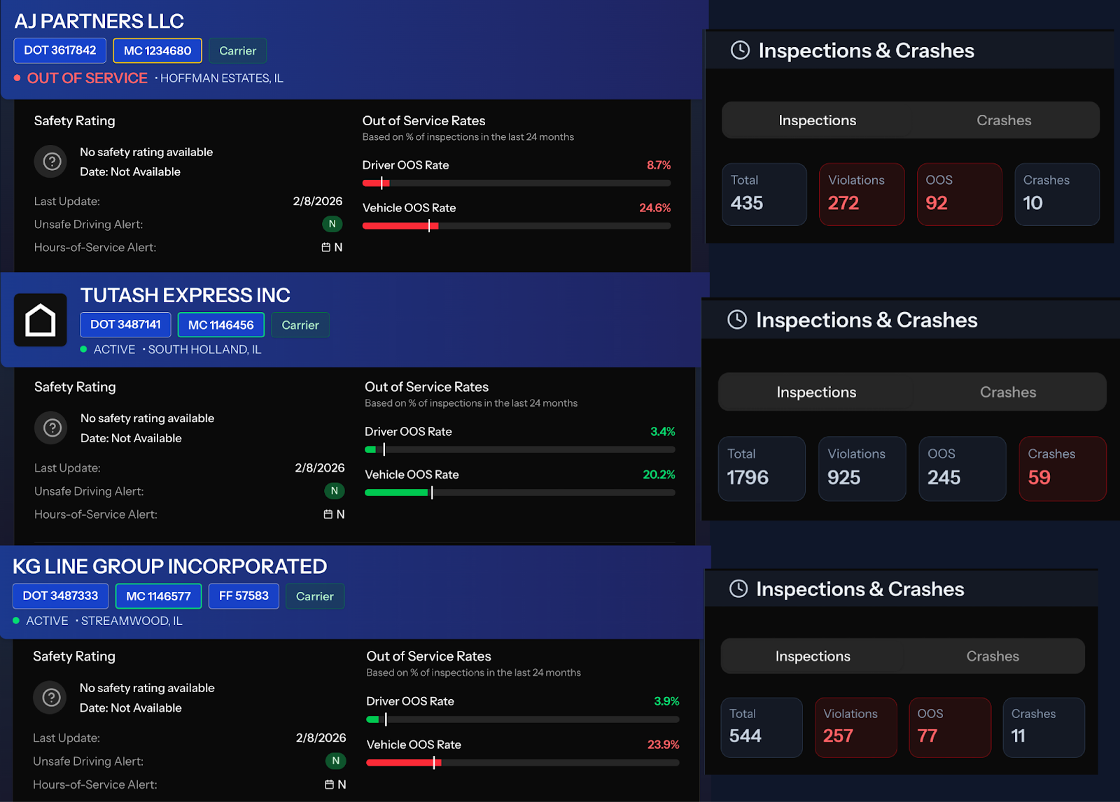 A review of the network’s history shows the public safety hazard posed by their presence on the road. Out of 2,775 inspections, AJ Partners received 1,454 violations and 414 out-of-service orders. Drivers were involved in 80 crashes. Those figures exceed national averages for both vehicle and driver out-of-service rates.