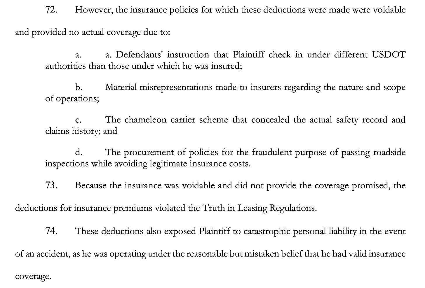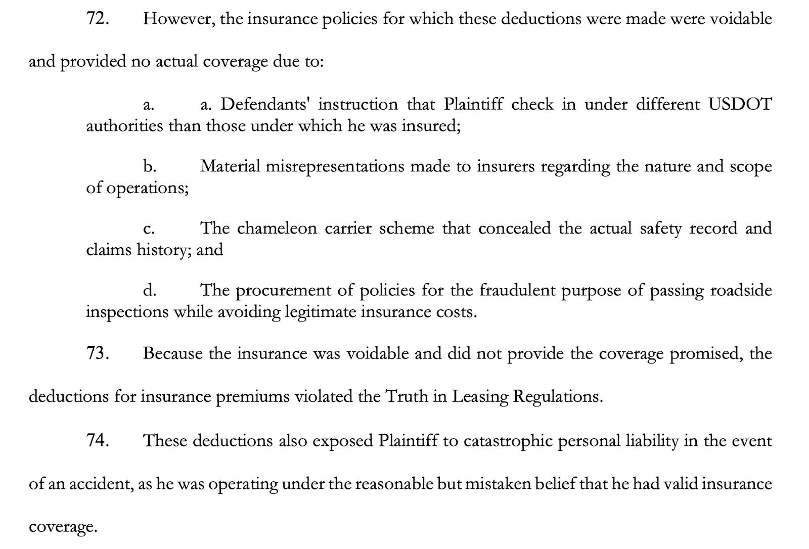 Another core allegation addresses how trucks and drivers moved through the web of companies. The complaint says drivers were moved between operating authorities, with loads dispatched under one carrier while insurance policies and electronic logs were tied to another.