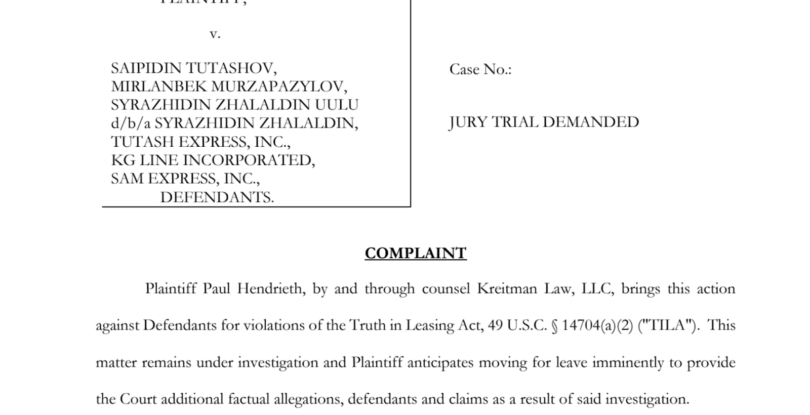 The complaint alleges the enterprise rotated drivers and equipment among multiple USDOT authorities, including Tutash Express, Inc., and KG Line Incorporated. This is the chameleon carrier framework described earlier, which allows operations to continue while reducing scrutiny, avoiding blacklists, and limiting exposure to liability.