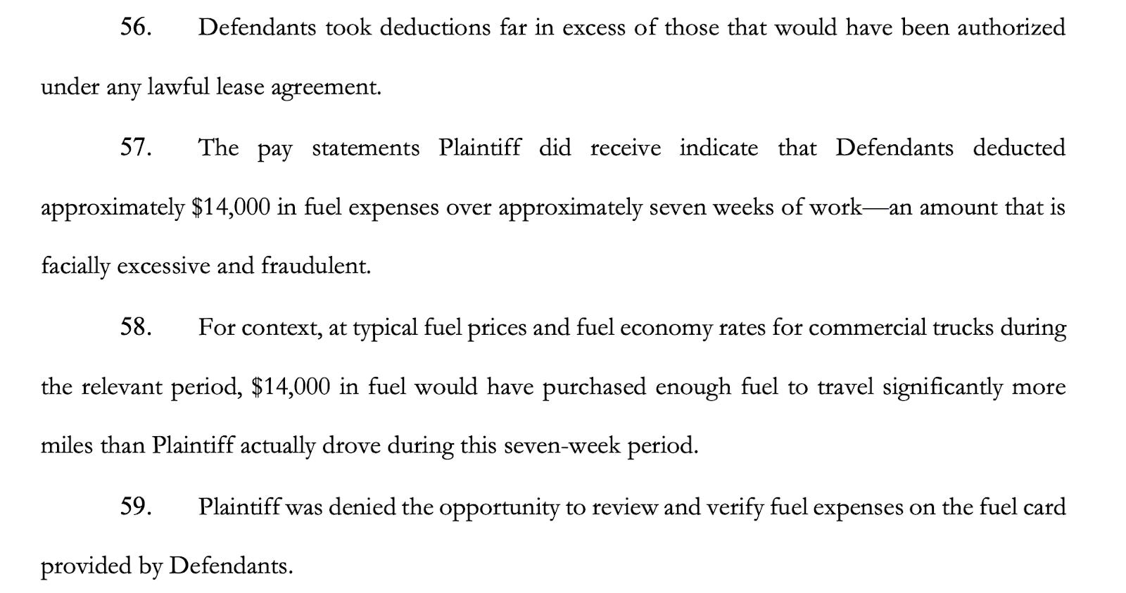 One example cited in the filing involves approximately $14,000 in fuel deductions over roughly seven weeks. Based on the mileage reportedly driven and average diesel prices during that period, the totals do not align with what the truck could reasonably have consumed.