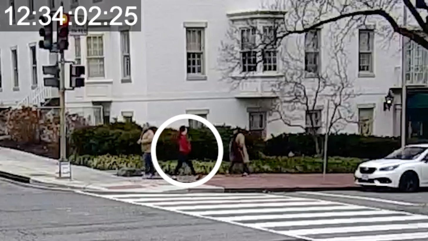 At 12:34 p.m., as she passed the Capitol Hill Club again on her way back to the alley—moments before discovering the device—no one matching Younger’s description was in front of the building. Instead, security footage shows her passing an individual, possibly a woman, as she rounded the corner just before the building. This person appeared to be wearing a baseball cap, scarf, and long camel-colored trench coat—not a “dark or black jacket,” nor a “motorcycle-type jacket,” as Younger described.