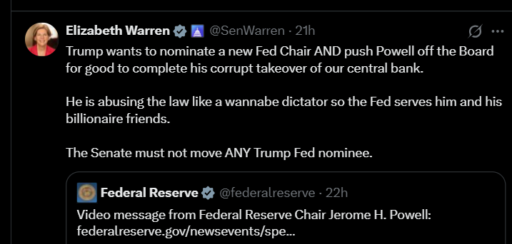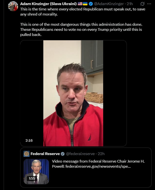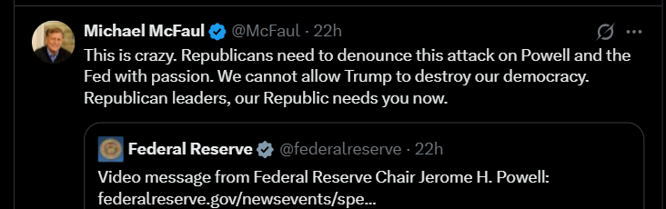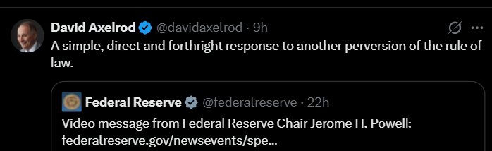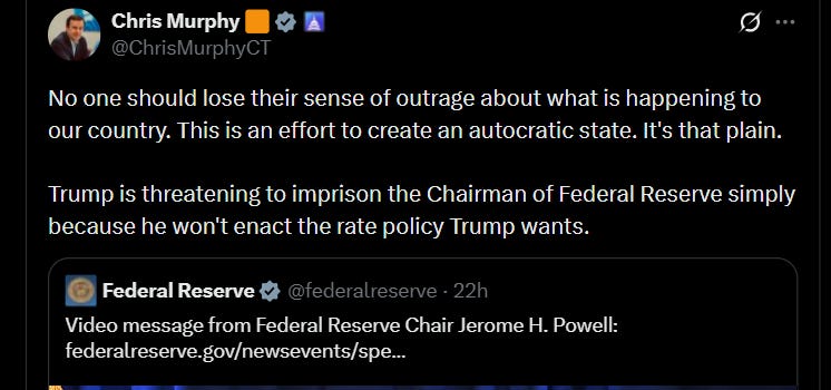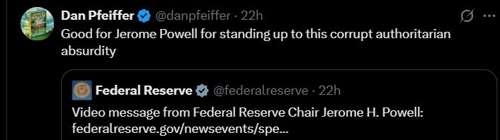 Shortly after the news broke about the investigation, Powell posted a video statement suggesting the investigation represented “political pressure [and] intimidation” from the president in an attempt to influence fed monetary policy:
